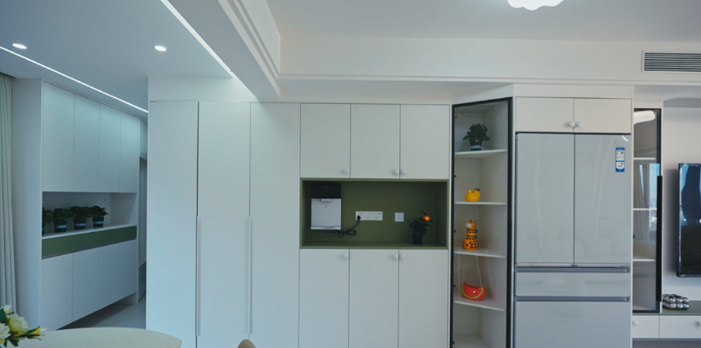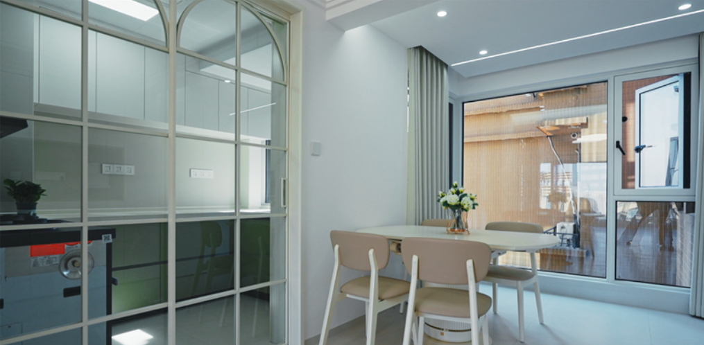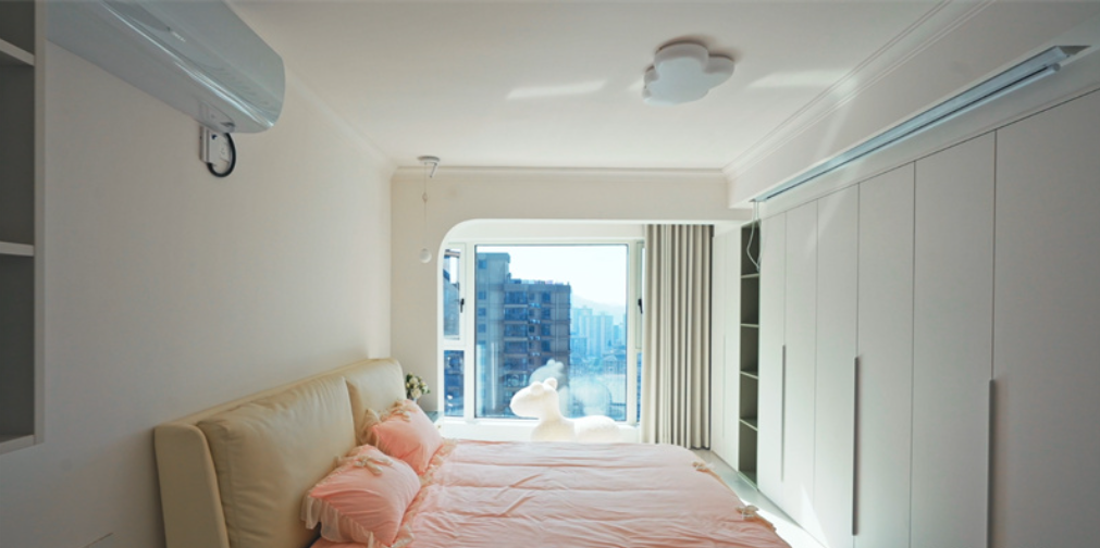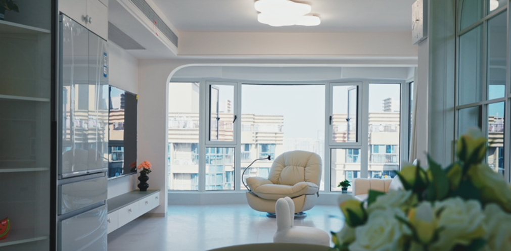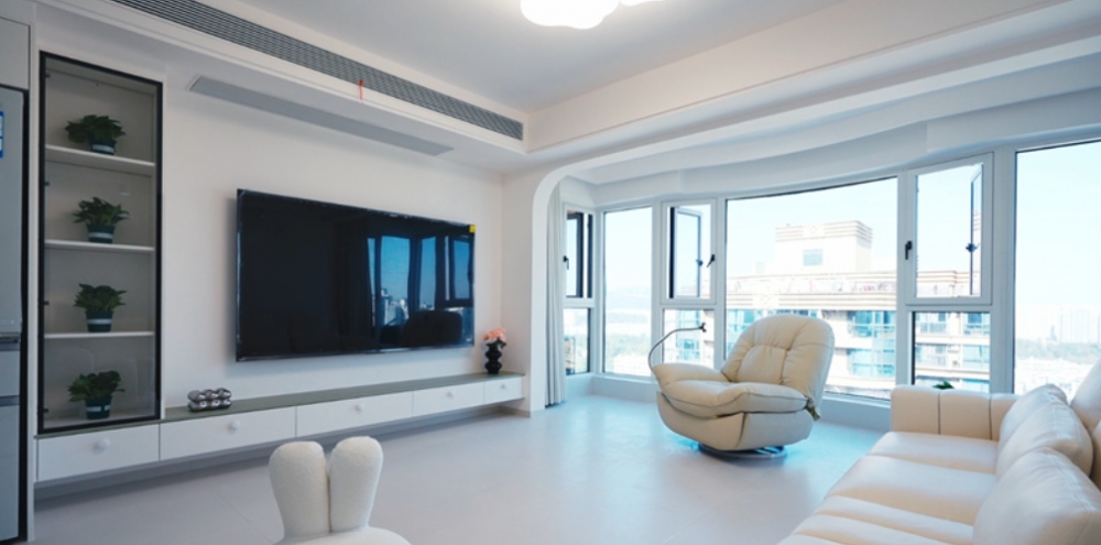 客厅内,大电视直接挂在墙上,下方配以简约的电视柜,旁边摆放着舒适的沙发和别致的休闲椅,没有过多的繁杂装饰,显得宽敞又明亮。大窗户的设计让室内光线充足,进一步增强了空间的通透感。